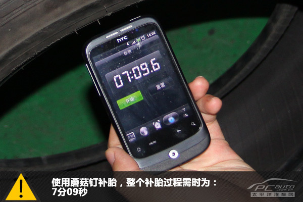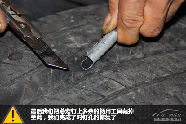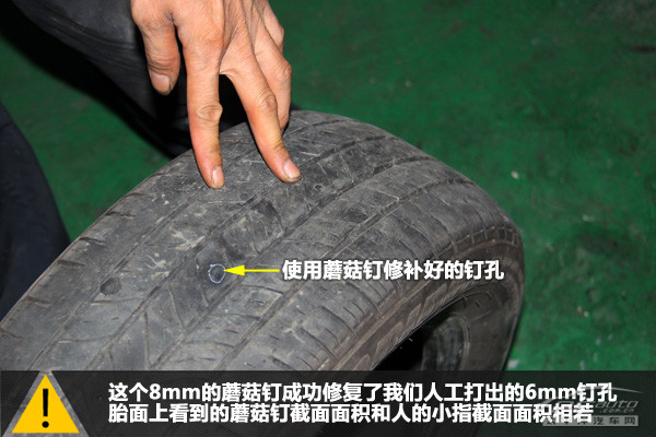 輪胎外部看到的是蘑菇釘?shù)谋慕孛妫私孛婷娣e與人的小指的截面面積相若。整個補胎過程用時7分09秒,時間比冷補還是要長不少。