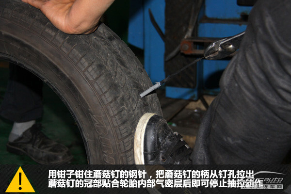 從輪胎外部用鉗子鉗住嘉寶龍蘑菇釘?shù)匿撫槪涯⒐结數(shù)谋鷱尼斂桌觥.斈⒐结數(shù)墓诓抠N合輪胎氣密層后即可停止抽拉動作。