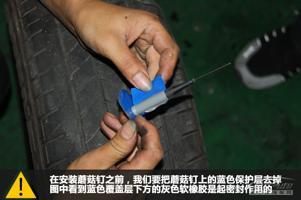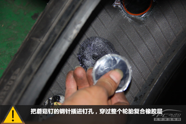 一切就緒,我們把蘑菇釘?shù)匿撫槒妮喬?nèi)部插進釘孔,穿過整個輪胎的復合橡膠層。