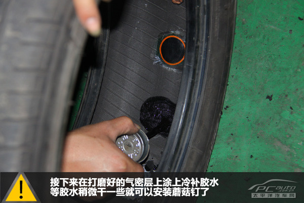 接下來我們在打磨好的氣密層上涂上冷補膠水,待冷補膠水稍微干一些就可以安裝蘑菇釘了。